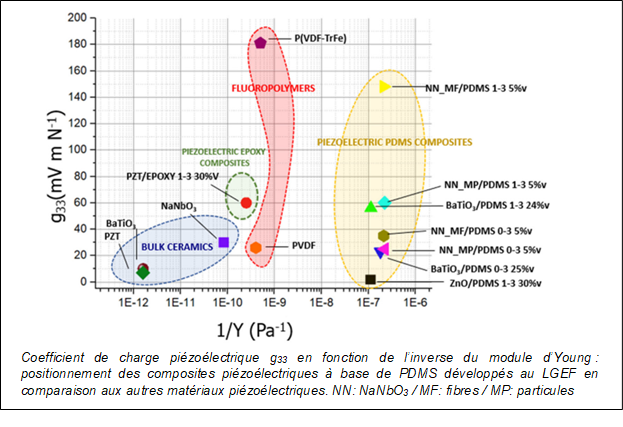 Le LGEF développe plusieurs types de composites pour leurs propriétés multifonctionnelles. Les polymères sont de différents types (PDMS, P(VDF-TrFE-VFE), PVDF, PU…) et les charges de différentes natures et de différentes tailles selon les applications visées. Elles peuvent être commerciales ou élaborées au LGEF.