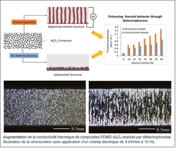Des composites polydiméthylsiloxane - alumine (PDMS-Al2O3) réalisés avec structuration diélectrophorétique montrent une augmentation significative de la conductivité thermique. Ces composites polymères performants à haute conductivité thermique suscitent un fort intérêt dans le milieu industriel pour dissiper la chaleur dans les dispositifs électroniques.