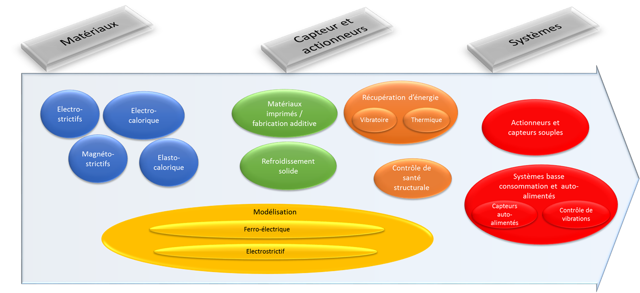 Le LGEF est un laboratoire expert dans le domaine des matériaux électroactifs (céramiques, monocristaux, composites polymères, encre électroactive) et dans l'utilisation de leurs propriétés couplées (électromécaniques, magnétoélectrique, électrocalorique, élastocalorique...) pour développer des actionneurs facilement intégrables et des capteurs autonomes en énergie grâce à leur capacité à être autoalimentés sur les gisements thermiques et vibratoires environnants. Il développe pour cela ses propres bancs de caractérisation des propriétés couplées et démonstrateurs.